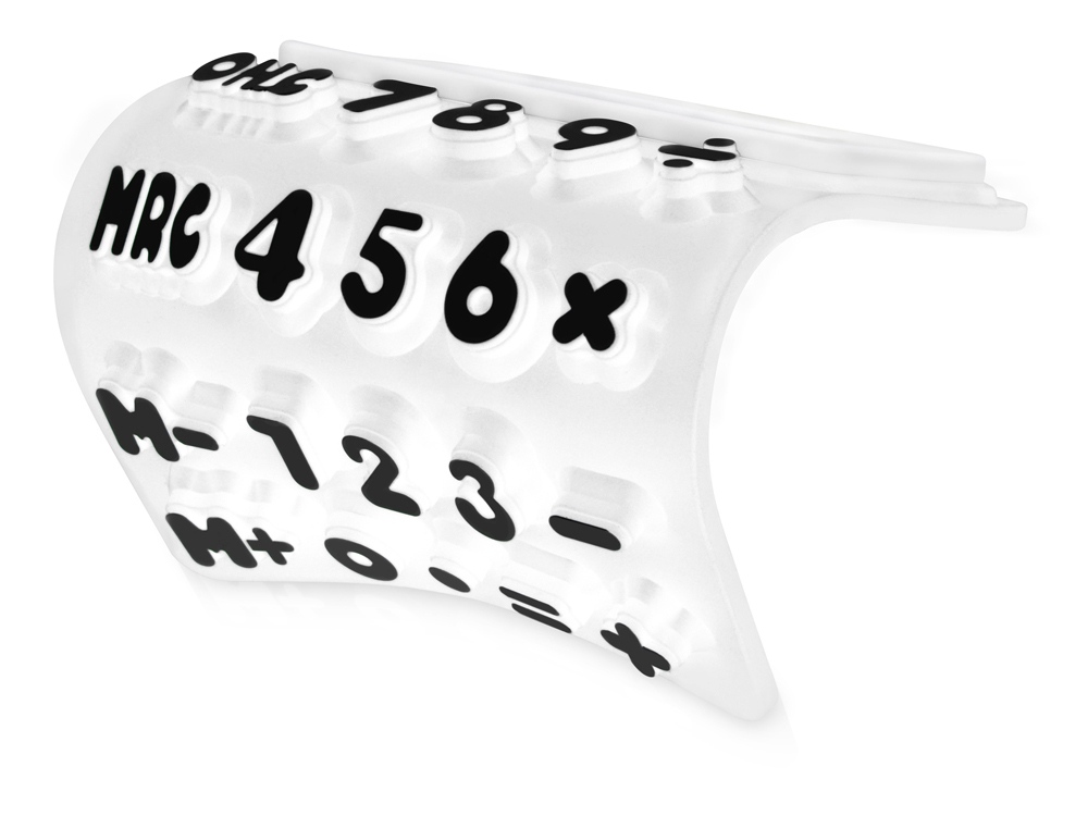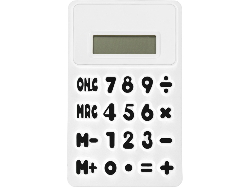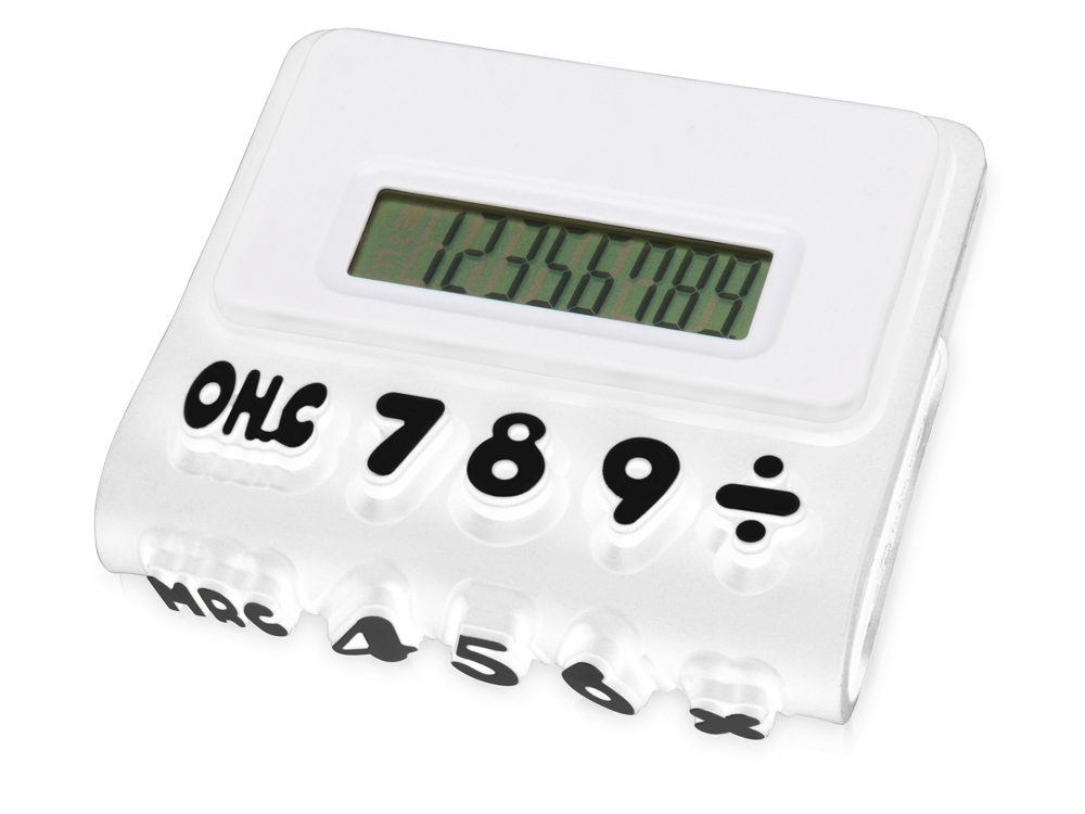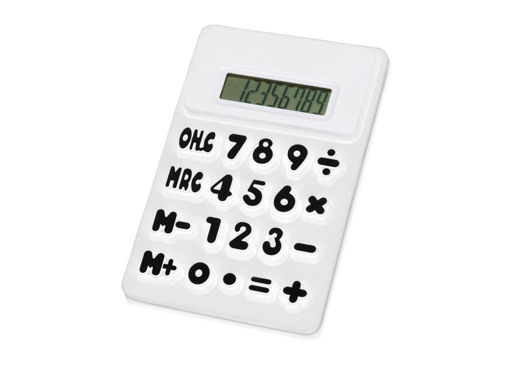 Гибкий калькулятор Splitz. Гибкий 8-разрядный калькулятор с белой отделкой, рельефными клавишами и функцией памяти. Батарейка включена в комплект. Силикон. Тампопечать (1 цвет (белые изделия)) на данный товар осуществляется бесплатно. Оплачивается только настройка оборудования в размере 2300 рублей на весь тираж.